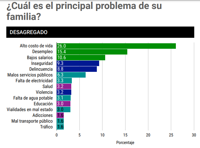 El sondeo, que contó con la participación de 7,931 dominicanos, también exploró las preocupaciones a nivel familiar. En este sentido, el alto costo de la vida vuelve a liderar con un 15.4%, seguido por el desempleo con el mismo porcentaje.
