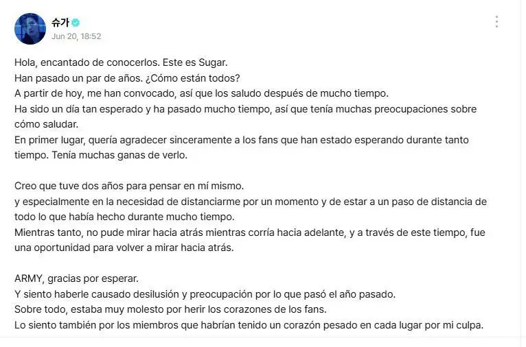 Aunque no hubo un evento oficial en Seúl para celebrar su salida, Suga se reencontró con ARMY a través de una carta publicada en Weverse, donde compartió sus sentimientos tras estos dos años de pausa obligatoria.