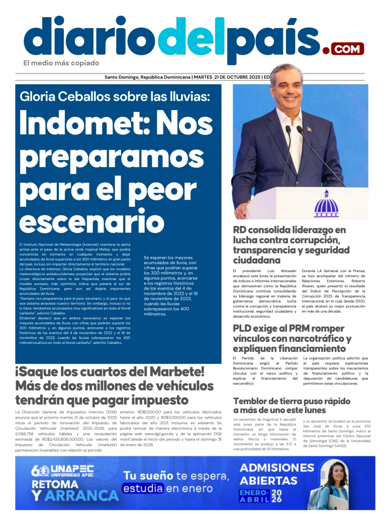Martes de paraguas abierto y bolsillos apretados 💸🌧️. El país se prepara para el impacto de lluvias intensas mientras Gloria Ceballos advierte que el peor escenario podría estar cerca. En medio del clima tenso, el Gobierno presume su liderazgo en transparencia, el PLD lanza dardos por vínculos con el narcotráfico y más de dos millones de choferes tendrán que sacar los cuartos para el Marbete. Ah, y por si fuera poco… hasta la tierra tembló.