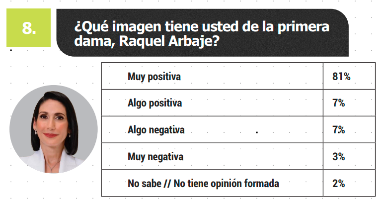 Según el estudio, Arbaje obtiene un 81% de valoración muy positiva. Mientras que, el senador de la Fuerza del Pueblo, Fernández, ha recibido una valoración pública notablemente positiva.