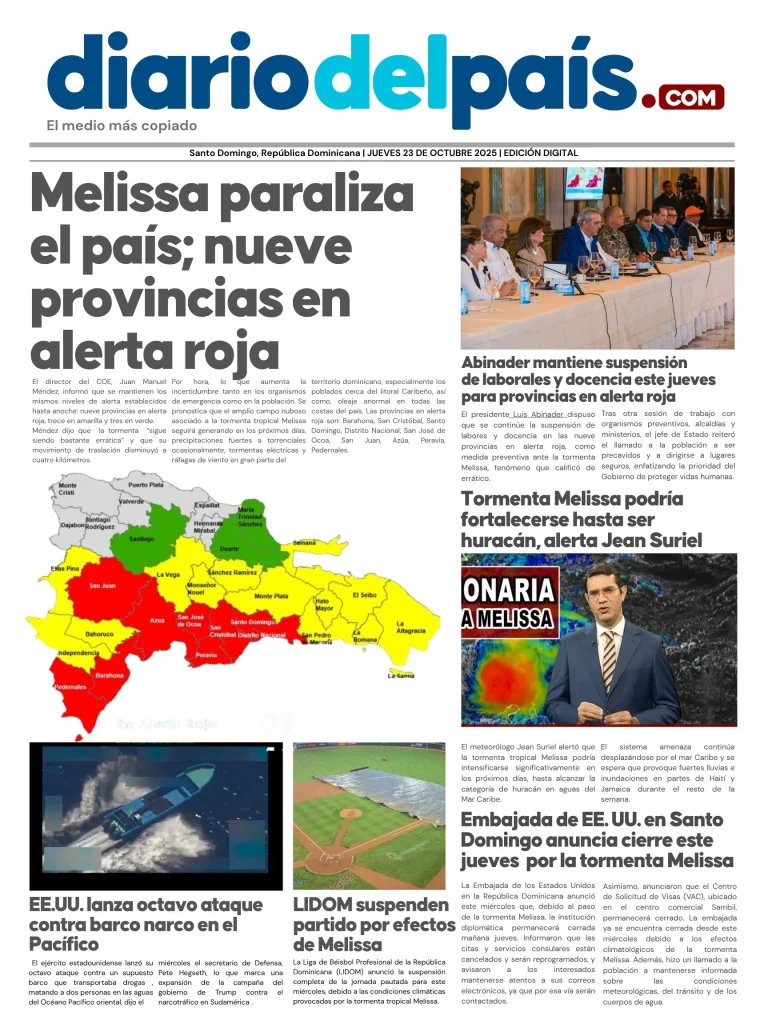 La tormenta tropical Melissa tiene al país en pausa. Nueve provincias están en alerta roja, las lluvias no dan tregua y el Gobierno suspendió las clases y labores por precaución. Mientras tanto, el COE mantiene vigilancia ante posibles inundaciones, Jean Suriel advierte que el fenómeno podría convertirse en huracán y EE.UU. cerró su embajada por seguridad. Todo el país con un ojo en el cielo… y el otro en la corriente.