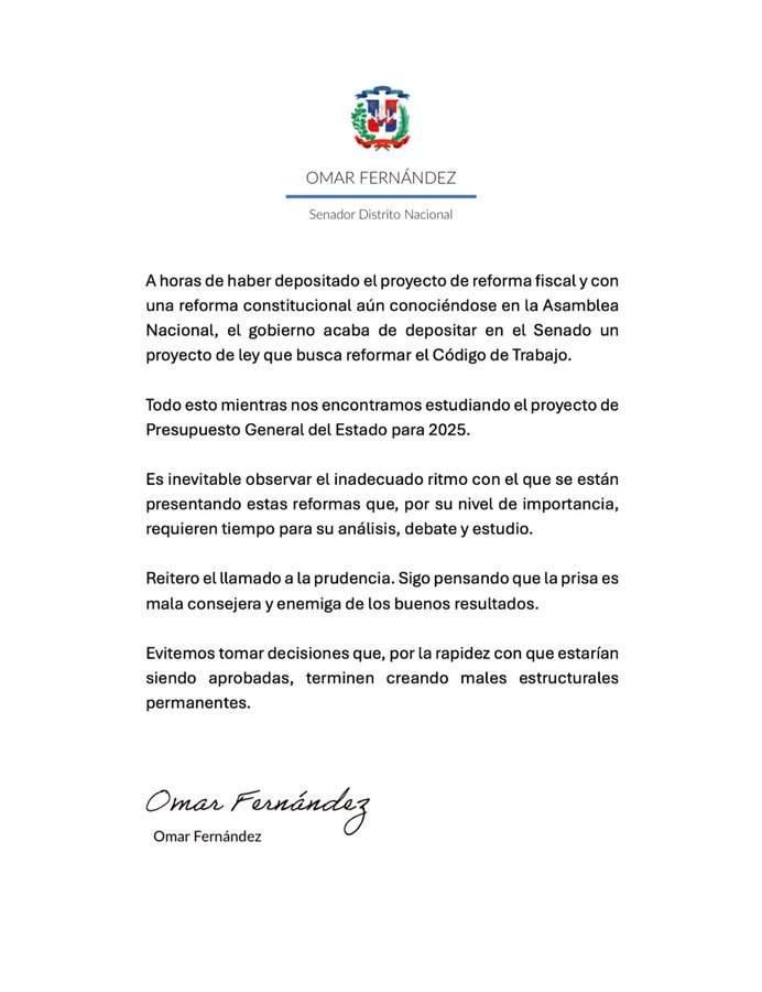 Santo Domingo, RD.- El senador del Distrito Nacional, por la Fuerza del Pueblo, Omar Fernández, manifestó su preocupación por el acelerado ritmo de presentación de los proyectos de reforma por parte del gobierno.