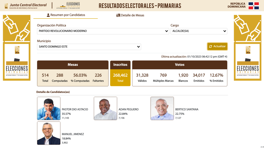 En la jornada electoral en Santo Domingo Este, el candidato Pastor Dio Astacio ha tomado una sólida delantera en los primeros resultados con el 35.29% de los votos escrutados, equivalente a 21,211 votos. El fervoroso respaldo a su candidatura ha sido evidente en las urnas, posicionándolo como el líder inicial en esta contienda electoral.