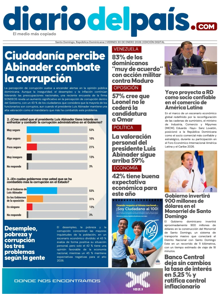 La ciudadanía mantiene una valoración mayoritariamente favorable del presidente Luis Abinader en materia de lucha contra la corrupción, pese a que persisten señales de alerta en la percepción pública. Una encuesta nacional de la firma SONDEOS revela que el 53 % de los consultados considera que el mandatario tiene un interés “muy seguro” en enfrentar y combatir la corrupción administrativa, mientras que un 10 % lo ve “algo seguro”. Además, el 53 % identifica al actual gobierno como el período en el que más se ha combatido la corrupción en el Estado.