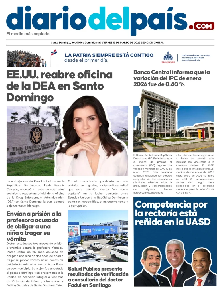 Uno de los hechos más destacados es el anuncio de la reapertura de la oficina de la Administración para el Control de Drogas de Estados Unidos (DEA) en Santo Domingo. La embajadora estadounidense en el país, Leah Francis Campos, informó que la agencia volverá a operar en territorio dominicano bajo un nuevo liderazgo, en lo que calificó como un paso importante para fortalecer la cooperación entre Estados Unidos y República Dominicana en la lucha contra el narcotráfico, el narcoterrorismo y la corrupción.